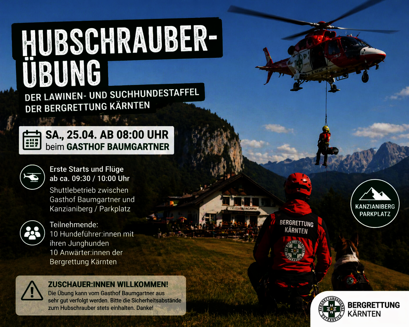 Die Übung kann vom Baumgartnerhof aus sehr gut beobachtet werden. Bitte unbedingt die Sicherheitsabstände zum Hubschrauber einhalten.